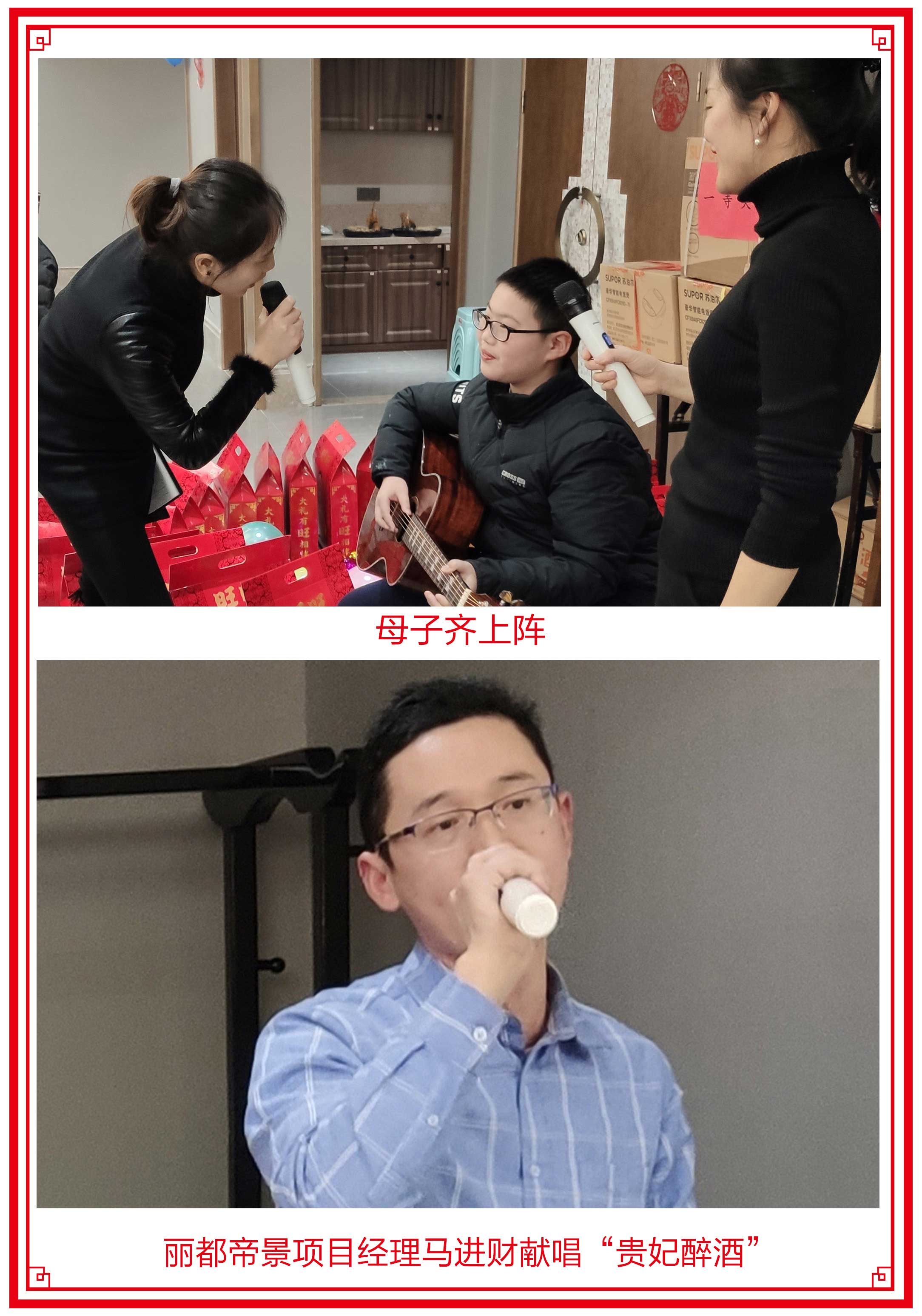 為了增加年會氣氛,第二分公司總經理楊靜攜兒子劉梓豪彈唱“和諧頌”、麗都帝景經理馬進財獻唱“貴妃醉酒”。